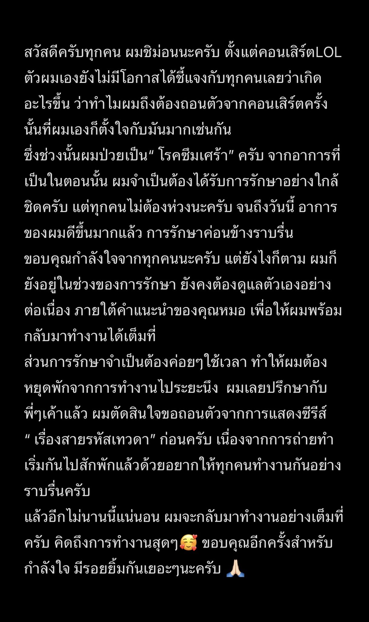 その間、私はその時の症状から「うつ病」を患っていました。厳重な治療が必要ですが、皆さん、今日まで私の状態はかなり良くなりました。治療はかなりスムーズに行われました。皆様のご支援に感謝いたします。