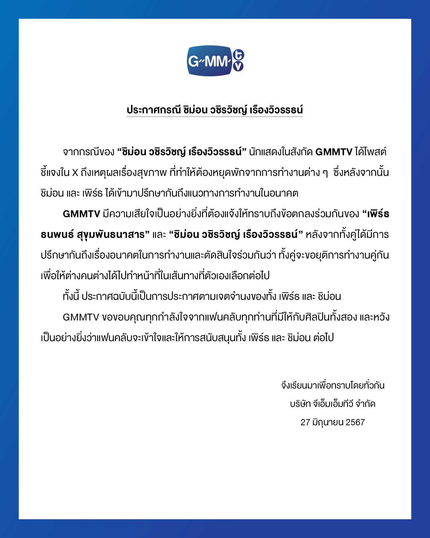 6月27日:GMMTVよりPerthとChimonのカップル活動終了が報告される